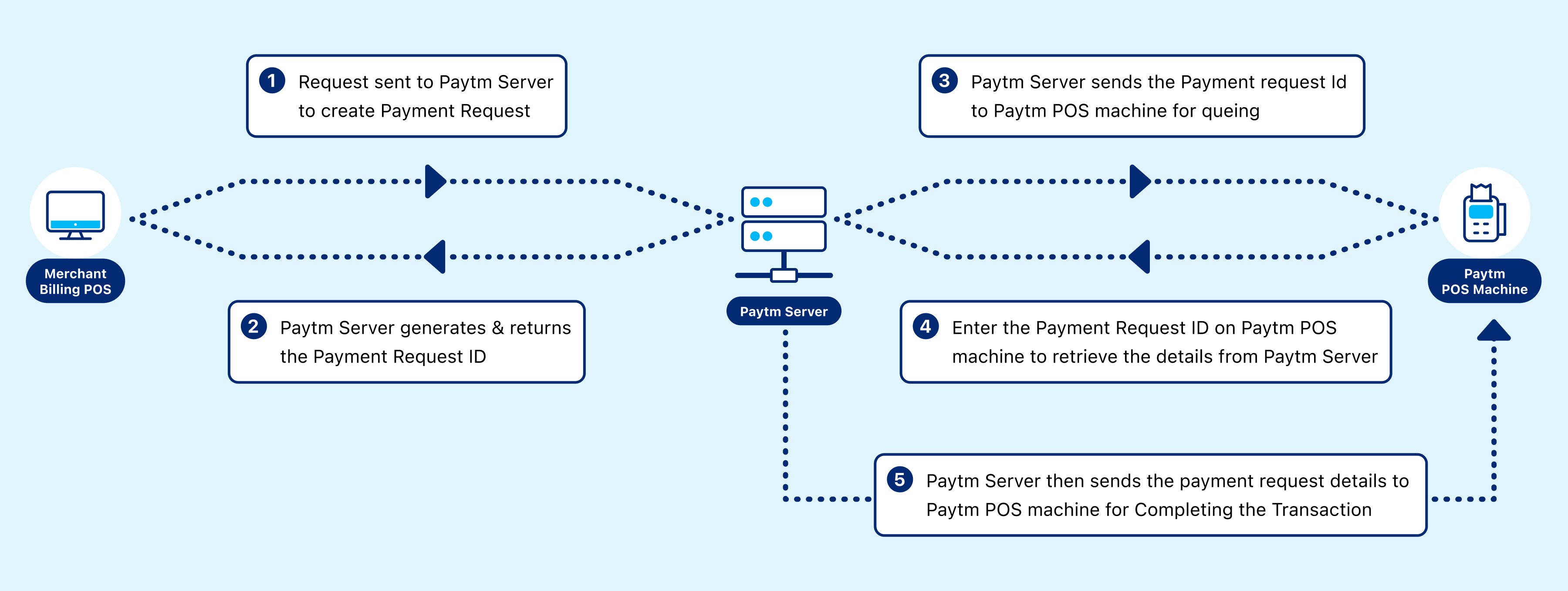 - Paytm's API generates a Payment Request ID (CPay) for the transaction and sends it back to the merchant's Billing POS.