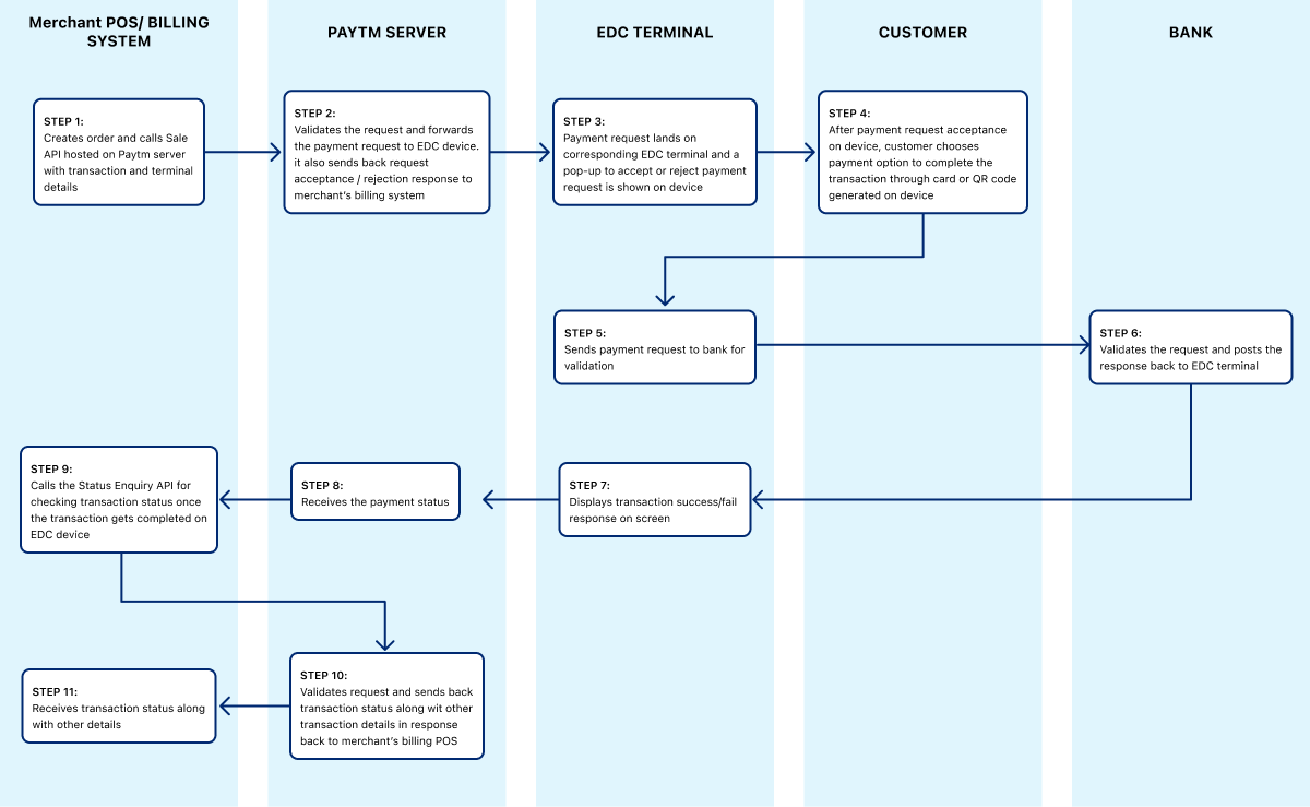- Merchant billing system creates orders and calls Sale API hosted on the Paytm server with the transaction and terminal details.