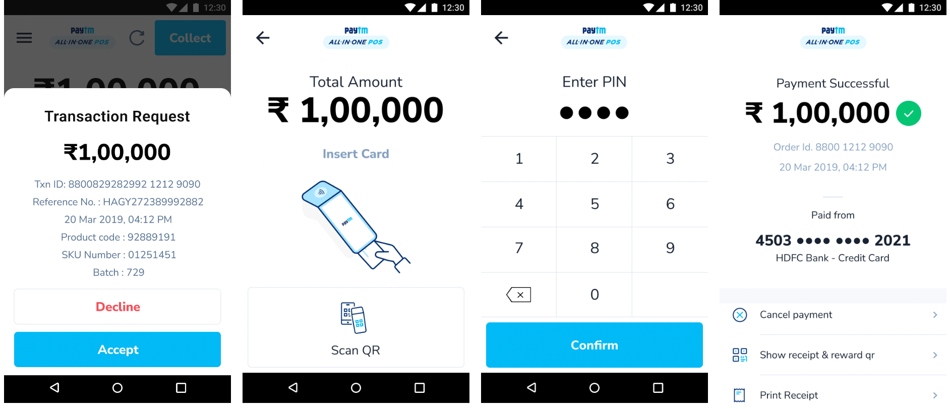 - Paytm POS machine displays transaction success/fail response on the screen and sends payment status to the Paytm server.